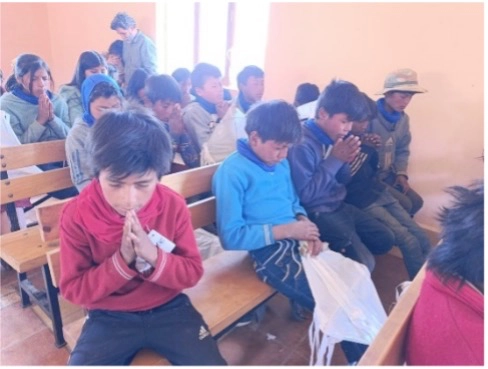 Tuvimos que buscar lugar para que los niños puedan dormir, cada niño se vino sin frazadas, no teníamos colchones, o colchonetas. Gracias a Dios llevamos unas bolsas de fibra de plástico esto sirvió de frazada y colchón, la capilla y un aula de la escuela fueron los lugares donde dormimos todos. Los niños del lugar volvieron a sus casas.
