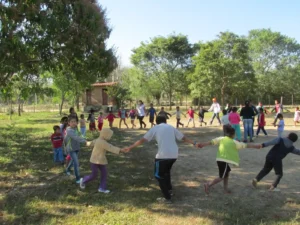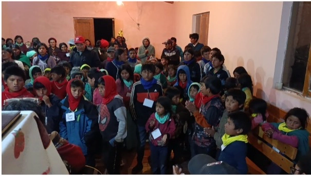 Es muy difícil planificar un campamento a distancia, y peor cuando se trata de niños, no sabíamos cuántos niños tendríamos, cuántos ambientes nos darían. Nos dijeron la cantidad de alumnos de las 5 comunidades que se reunieron para hacernos la invitación. Si todos venían eran 230 niños y prejuveniles. Pero, damos gracias a Dios que tuvimos 105 niños, algunos viniendo de muy lejos, tendrían que volver a pie dos días. Y nosotros solo éramos 10 personas.